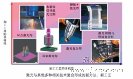 就拿激光焊接技術(shù)來說,在激光復合工藝的發(fā)展中已出現(xiàn)了如雙點或雙束激光的復合、激光與電弧的復合、激光與攪拌摩擦熱復合以及激光與電阻熱復合等形式;并呈現(xiàn)與其他相關(guān)技術(shù)結(jié)合及功能延伸的趨勢,如與水射流、鉚接等結(jié)合而形成的新工藝(見圖)。