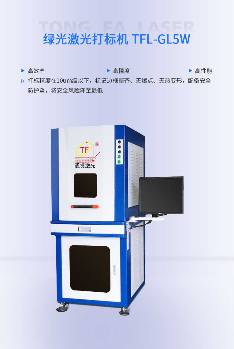 通發(fā)激光研發(fā)的TFL-GL3W/5W 綠光激光打標(biāo)機(jī)配備安全防護(hù)罩,避免設(shè)備操作員誤操作引起的人身傷害,將安全風(fēng)險降至最低,產(chǎn)品遠(yuǎn)銷海內(nèi)外.打標(biāo)精度在10μm級以下,標(biāo)記邊框整齊、無爆點、無熱變形,有效提高加工的成品合格率,使用壽命長、配合全封密光路、特別加固的光路底座滿足長期、穩(wěn)定性的工作需要。