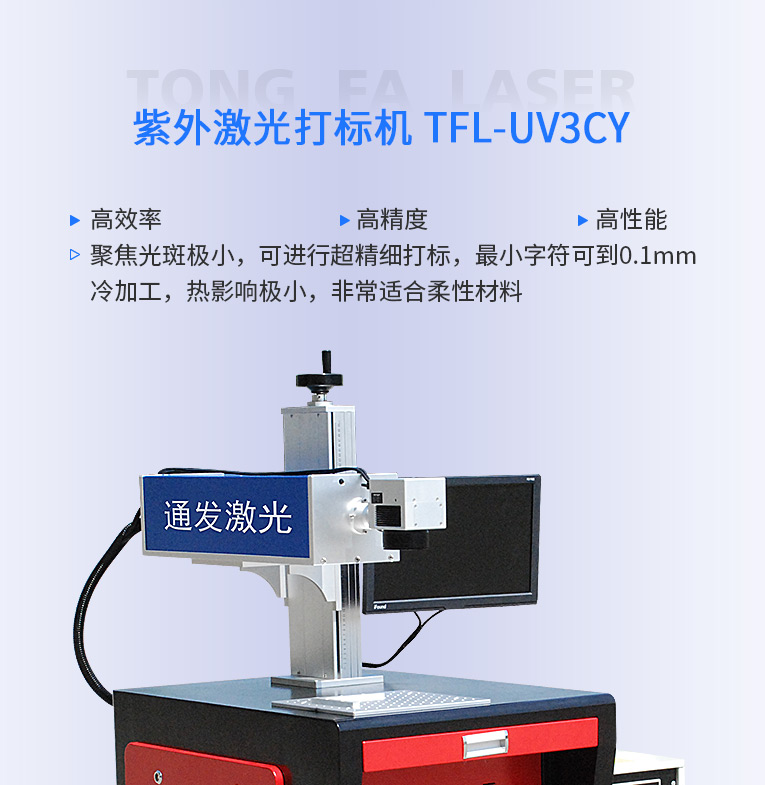 通發(fā)紫外激光打標機聚焦光斑極小,可進行超精細打標,最小字符可到0.1MM,冷加工,熱影響極小,不會有明顯燒痕,非常適合柔性材料、玻璃PCB標識、特殊材料等高品質(zhì)打標加工