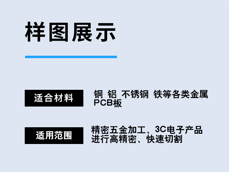 適用范圍廣,可加工銅、鋁、不銹鋼、鐵、pcb板、磁性材料等多鐘材料。幅面大小可選,長(zhǎng)度可根據(jù)用戶加工需求定制。切割速度快,效果光滑平整,切口沒有機(jī)械應(yīng)力,光滑平整無(wú)剪切毛刺。